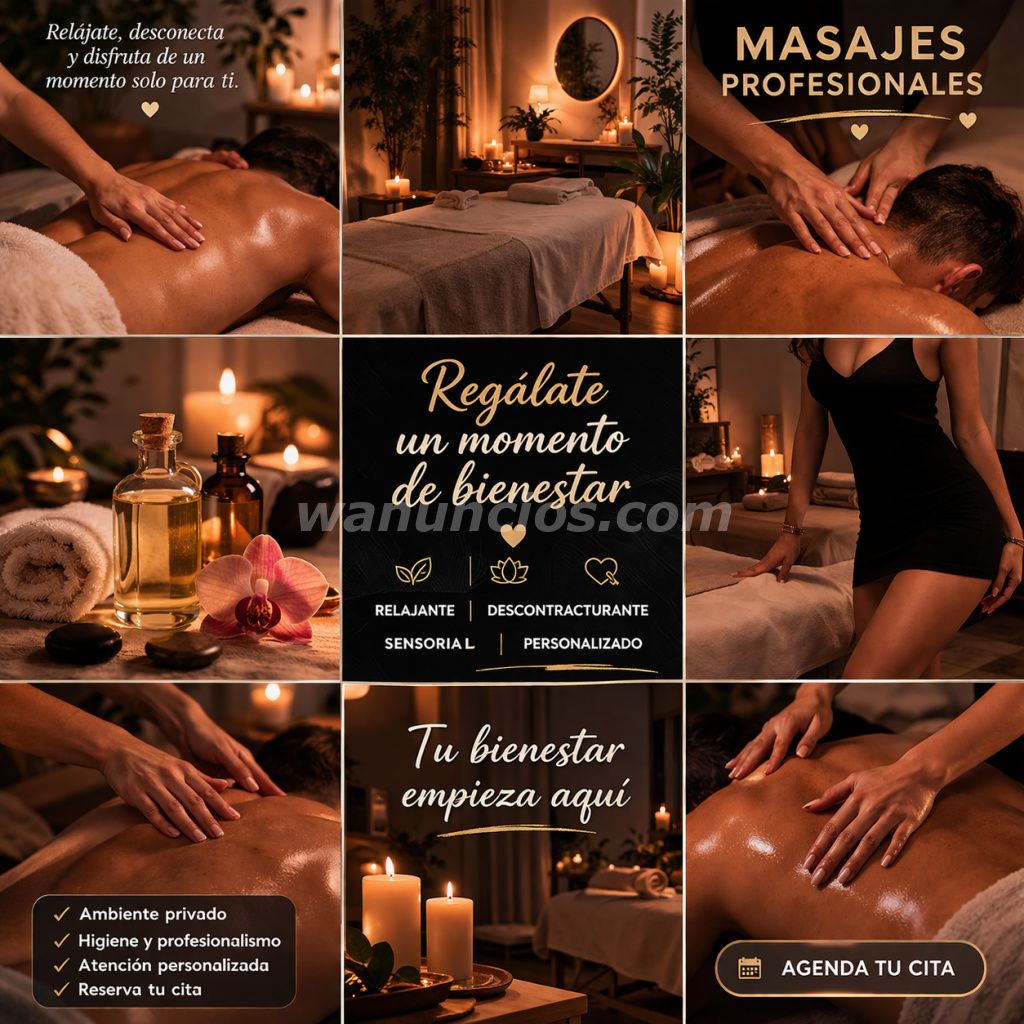 Hola, soy Daniela Ofrezco masajes relajantes en un ambiente privado, cómodo y discreto. Ideal para liberar estrés, tensión y desconectar del día a día. Brindo una atención personalizada, con dedicación y respeto. Experiencia cálida y profesional Ambiente limpio y seguro Total discreción Sesiones desde $120 Cupos limitados Escríbeme para más información y reservas